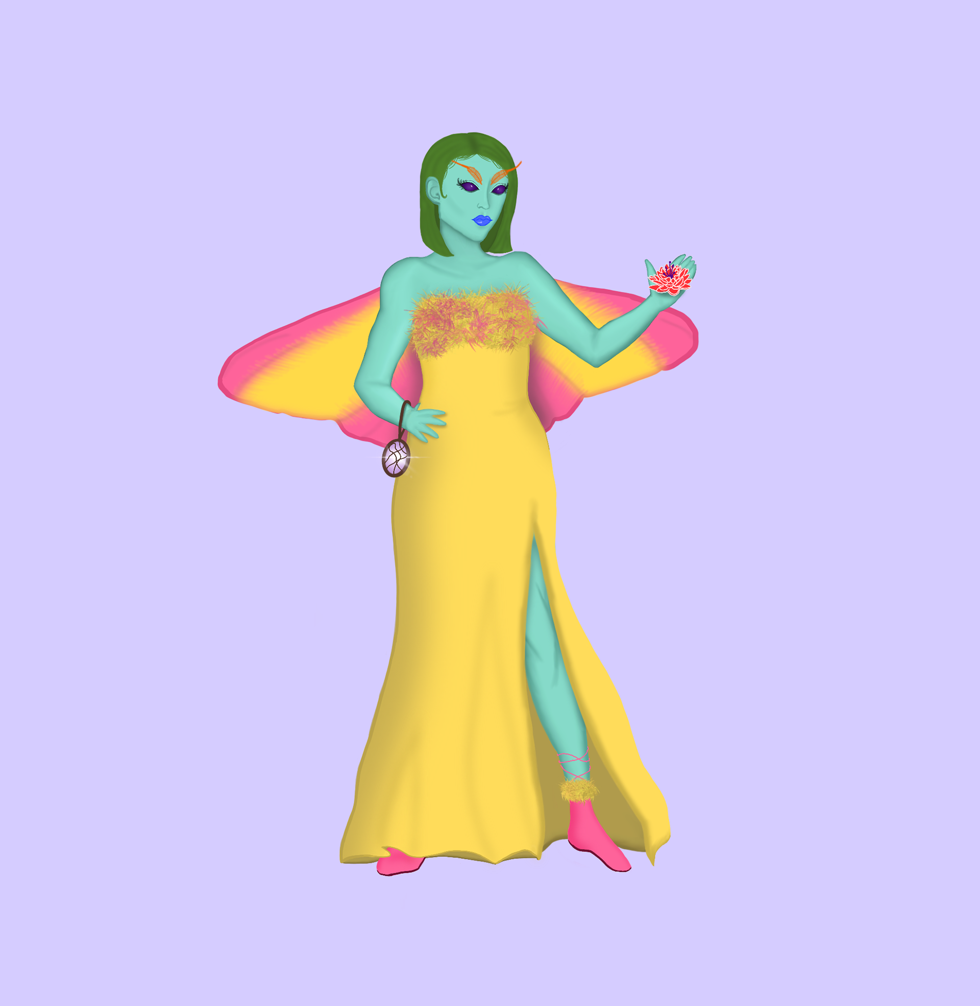 I drew Rubicunda for a character design class during my time at NAIT. I was given a character description as a starting place. This character was supposed to be a beautiful humanoid alien with insect like features or clothing. Through my brainstorming process, I decided to go with a super model style character whose fashion is styled after the rosy maple moth, also known as Dryocampa rubicunda. My favorite digital drawing program is Procreate, which was my medium of choice for Rubicunda.